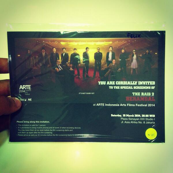Malam tadi, Sabtu, 15 Maret 2014, saya menyaksikan The Raid 2: Berandal. Film ini menjadi pembuka section film ARTE Festival 2014. The film is so fucking awesome.
