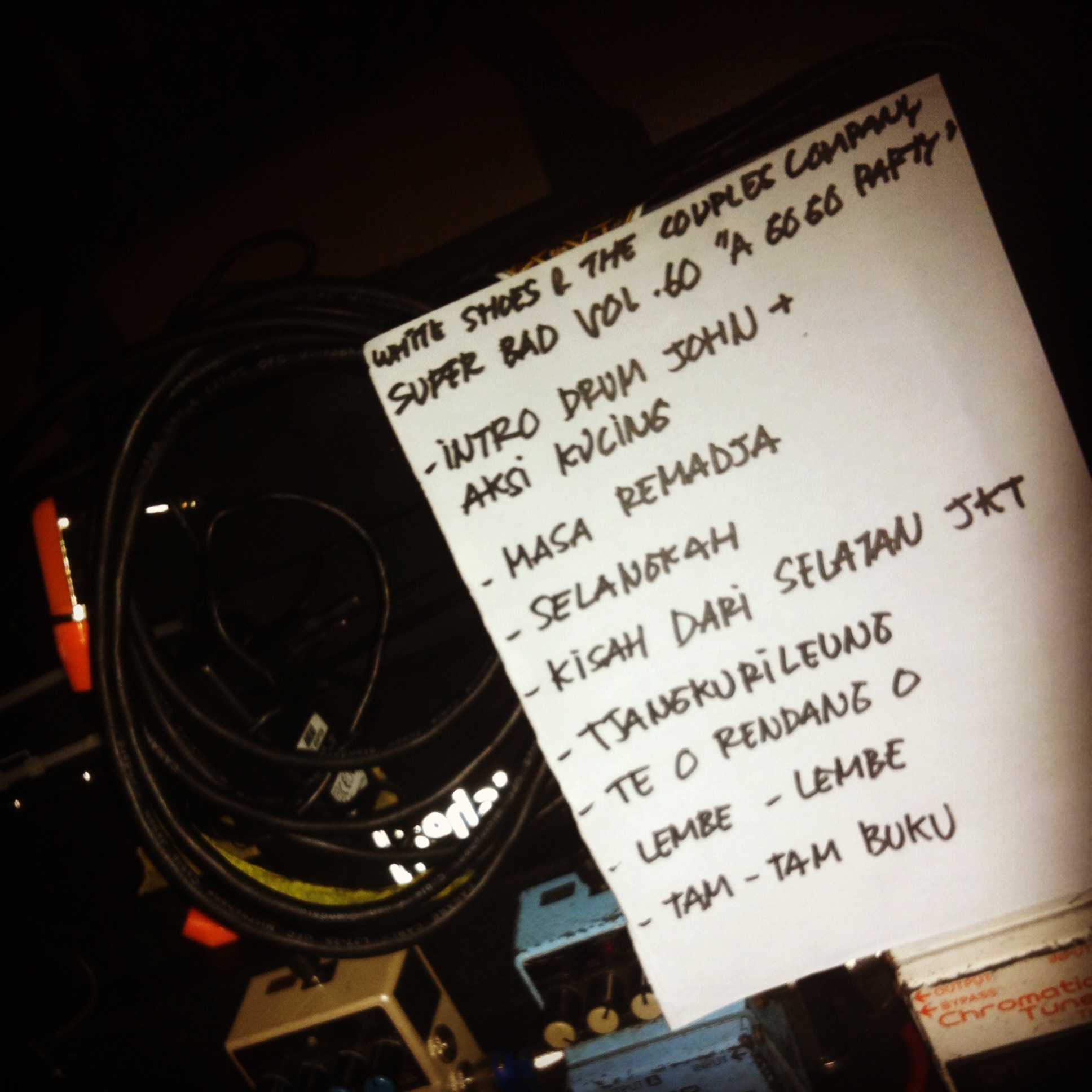 Saya kemudian mengintip setlist yang sudah mereka susun untuk pertunjukan tadi. Shekill, salah satu kru mereka menginformasikan bahwa mereka akan memainkan 8 lagu. “Nggak banyak kok, cuma 8,” katanya pada saya.