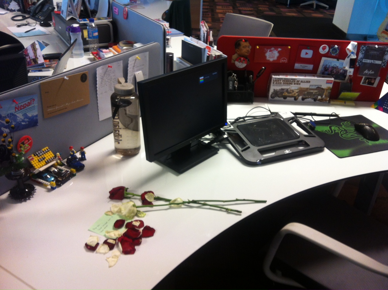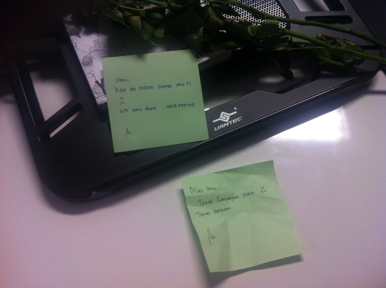 Kami terbahak-bahak. Ibnu nampak kebingungan. Setelah ngalor-ngidul, kembalilah kami ke meja kerja masing-masing. Wajahnya berubah begitu melihat ternyata benar-benar ada bunga lagi di mejanya. Haha. Berhasil!