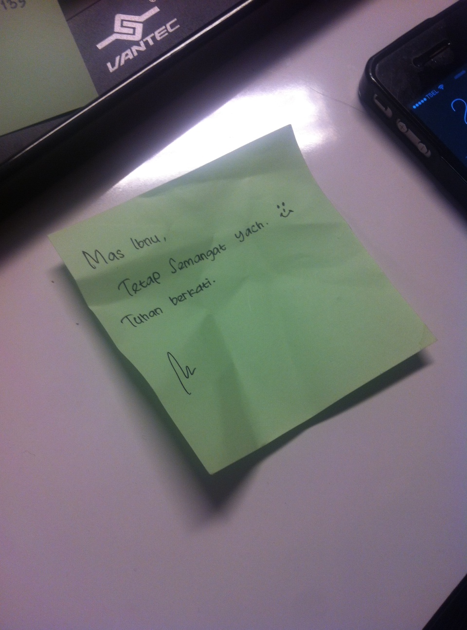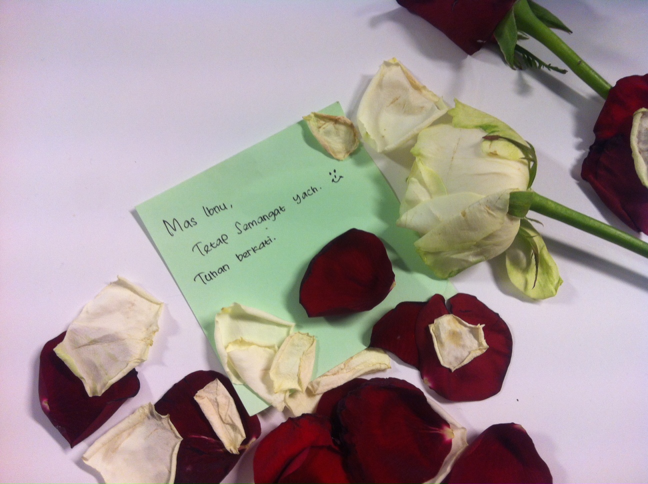Satria mengatur display bunga sementara saya mencari kertas post it untuk menulis pesan. Untuk mengurangi kecurigaan yang mungkin muncul, saya meminta Magdalena Winata, kawan kami yang lain untuk menorehkan tulisan tangannya di kertas post it yang akan disertakan di sebelah display bunga yang sudah disusun oleh Satria.