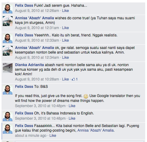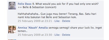 Yang lebih mencengangkan adalah perkataan Abazh setelah konser, “Eh, friend, inget nggak kalau kita pernah bertukar komen bahwa kita akan nonton Belle and Sebastian bareng?”