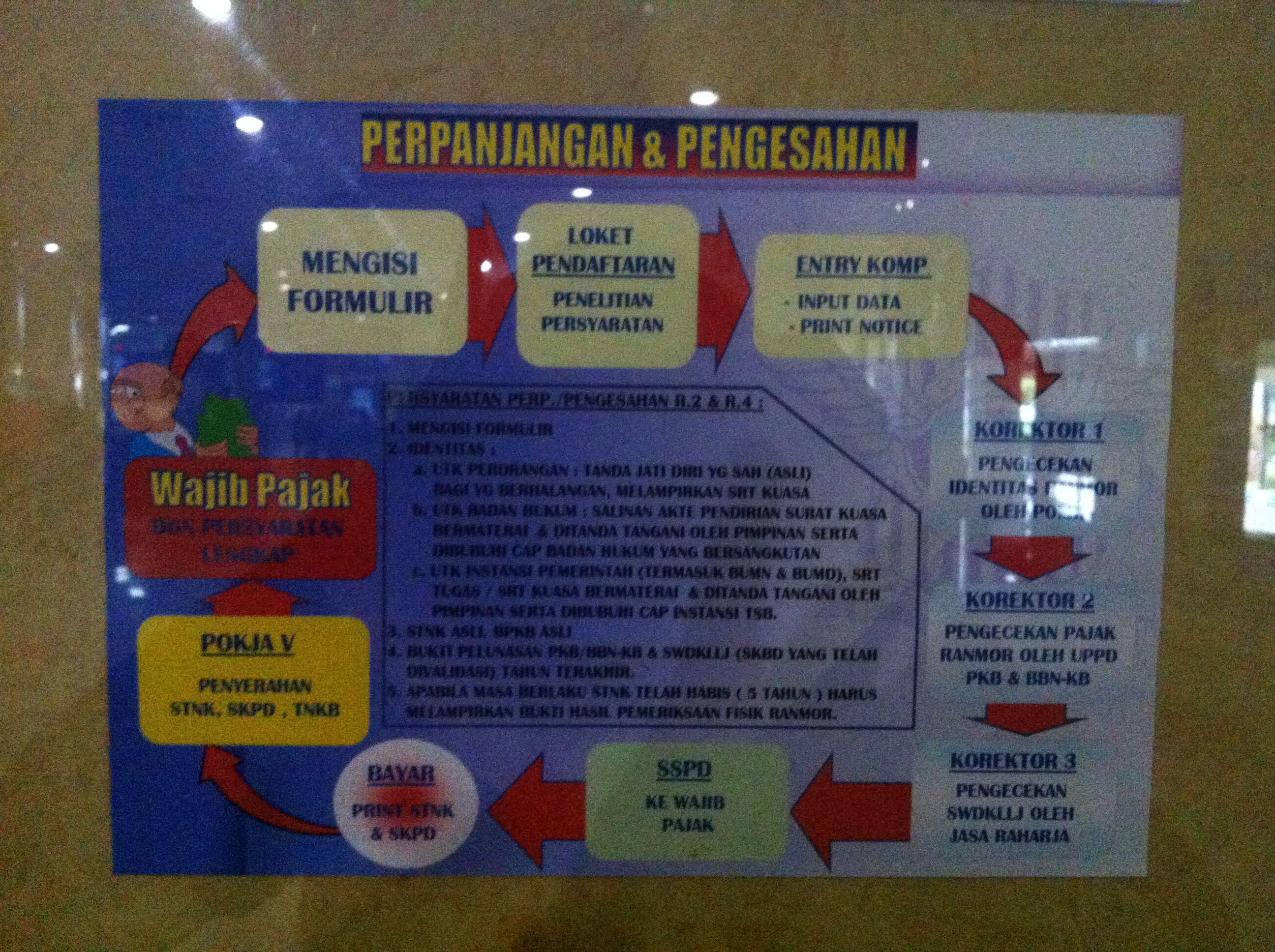 Pemerintah, dalam hal ini Dispenda, masih menyimpan sedikit romantika masa lalu. Mereka masih bodoh untuk urusan menyusun informasi urutan proses yang harus dilakukan. Atau pura-pura bodoh? Entahlah. Yang jelas, alurnya tergambar dengan rumit di papan informasi yang mereka punya di lobi gedung pelayanan satu atap itu.