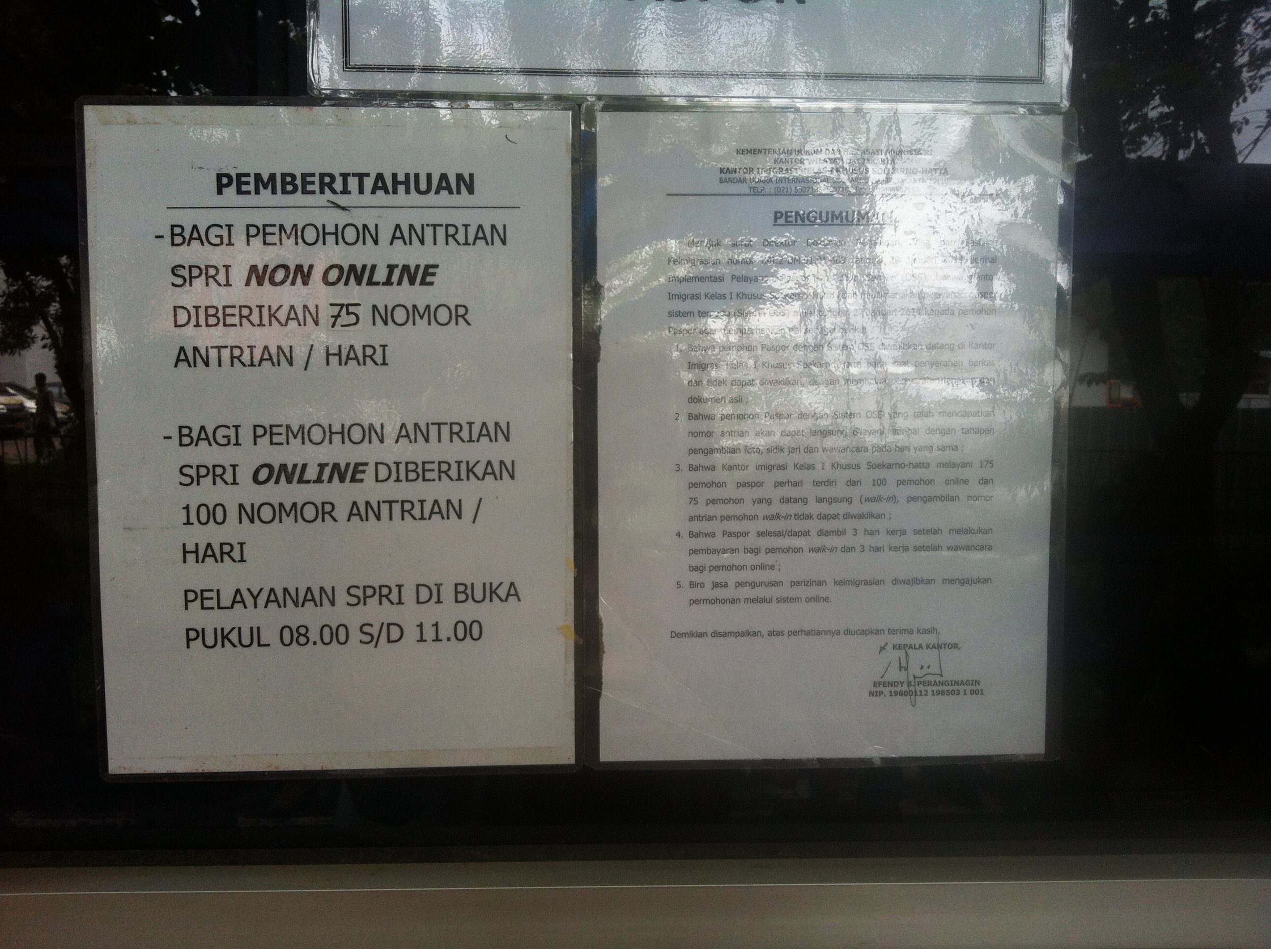 Tapi, namanya berurusan dengan pegawai negeri, mereka agak saklek untuk urusan jam kerja. Usahakan datang di waktu normal di mana jam istirahatnya tidak panjang. Kalau ketemu Jumat yang jam istirahatnya kelewatan lama atau Sabtu yang jam kerjanya pendek, lebih baik datang sepagi mungkin. Pelayanan dimulai pukul delapan pagi. Tepat.
