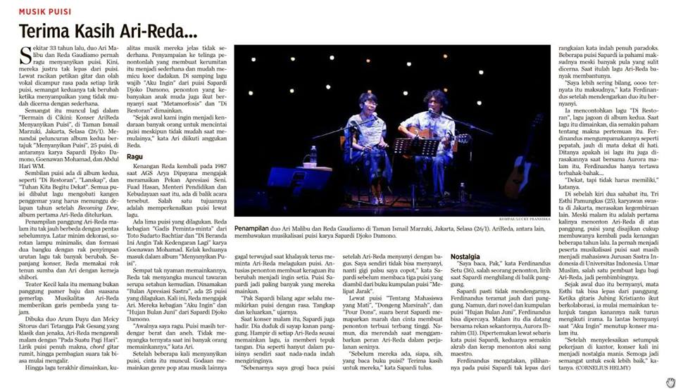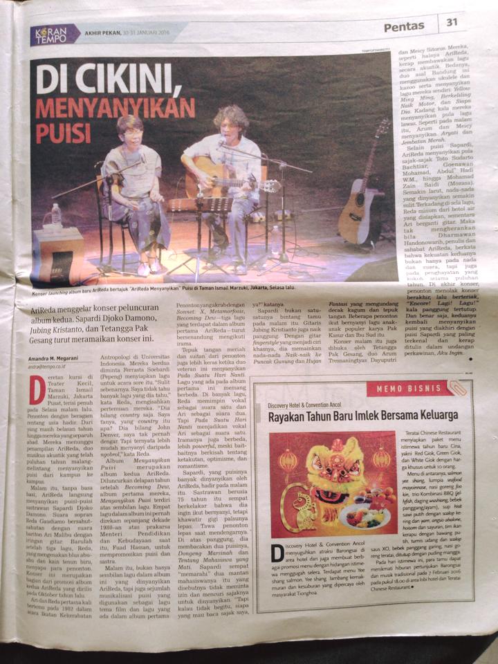 Paragraf di atas diambil dari tulisan saya di booklet pengantar Bermain di Cikini: AriReda yang dibagikan kepada masing-masing penonton yang memiliki tiket di kedua pertunjukan yang terjadi tanggal 26 & 27 Januari 2016 yang lalu. Kedua pertunjukan tersebut tiketnya habis sehari sebelum seri dimainkan. Sold out.