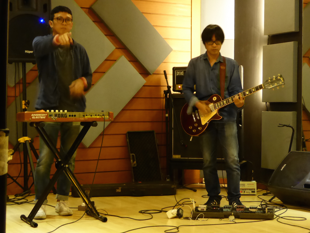 Kami sedang menertawakan microphone Jimi yang mati. “Liat nih, dia ketok dulu baru nyala,” lanjut Malau. Benar saja, setelah diketok ke salah satu bagian panggung, microphone itu menyala.