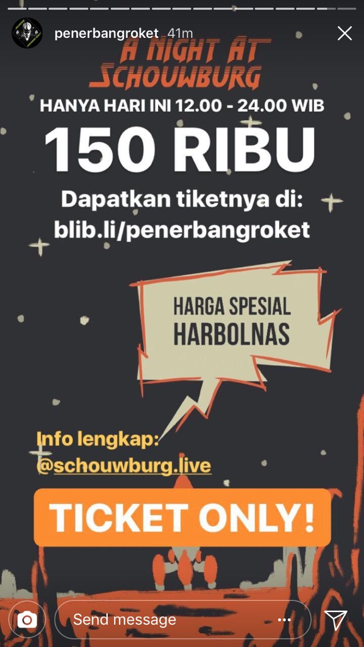 Lalu, harbolnas datang. Hari ini –ketika tulisan ini mulai ditulis—, 12 Desember 2017, keluar promo tiket Paket Pencarter Roket 2 seharga Rp.150.000,00. Katanya, diskon khusus harbolnas. Paket itu spesifikasinya hanya akses untuk nonton pertunjukan. Tidak termasuk cd seperti harga normal.