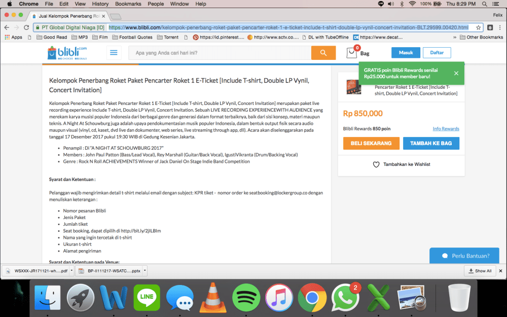 Untuk ukuran sebuah pertunjukan musik, harganya tidak main-main. Tapi karena merupakan seorang penggemar, plus acaranya khusus, ya masuk akal untuk dibelalah. Tiket dijual via Blibli.com yang menyediakan fasilitas pembelian dengan kartu kredit. Saya akhirnya memilih Paket Pencarter Roket 1. Kenapa?