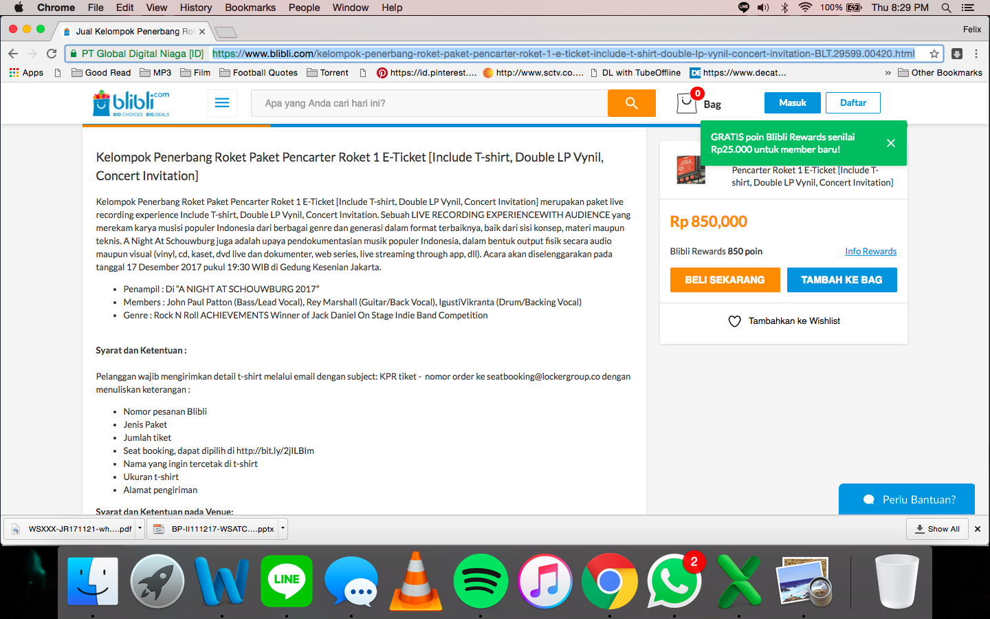 Untuk ukuran sebuah pertunjukan musik, harganya tidak main-main. Tapi karena merupakan seorang penggemar, plus acaranya khusus, ya masuk akal untuk dibelalah. Tiket dijual via Blibli.com yang menyediakan fasilitas pembelian dengan kartu kredit. Saya akhirnya memilih Paket Pencarter Roket 1. Kenapa?