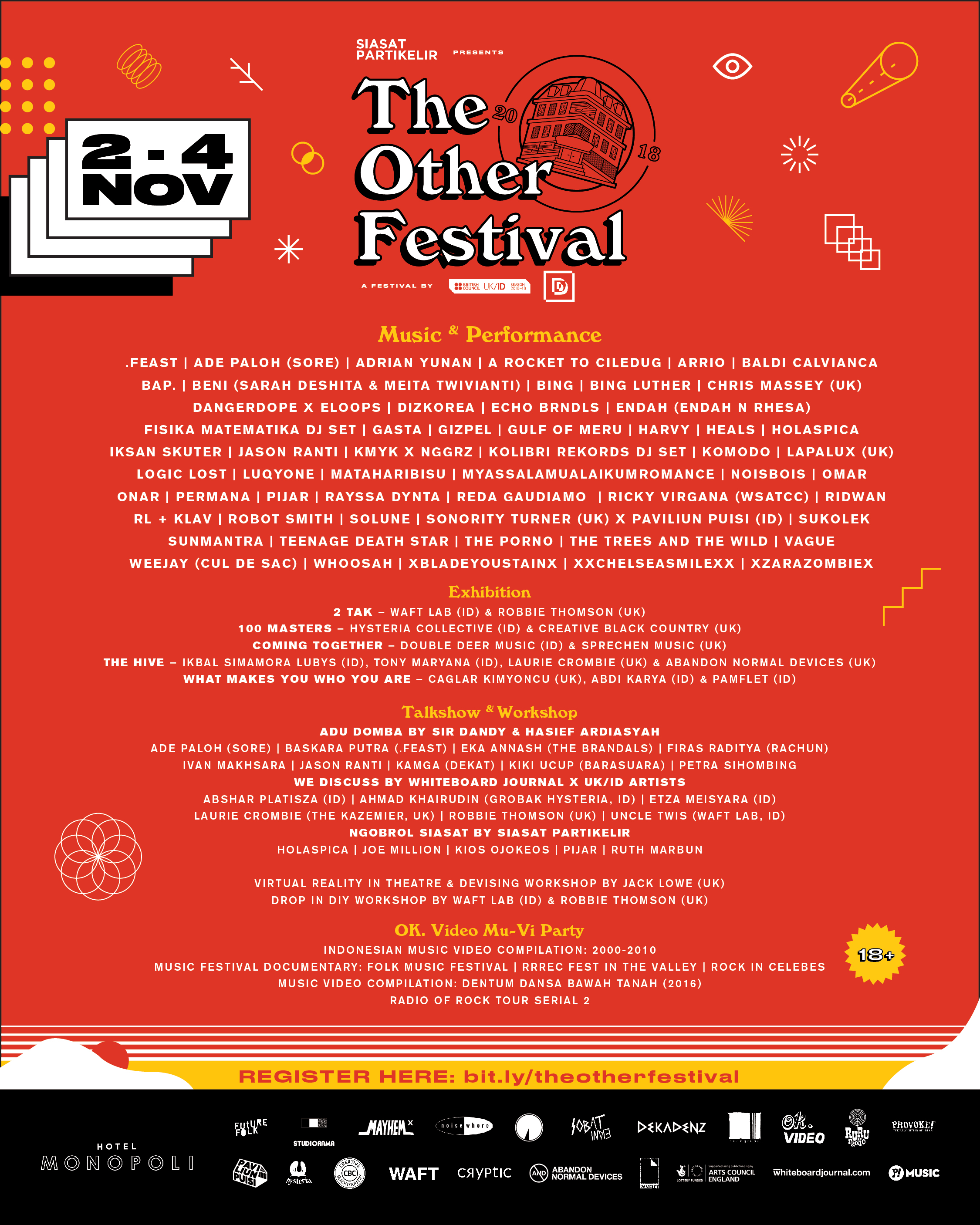 Wah, agak melantur ceritanya. Jadi, begini. Malam ini, tepat sebelum tulisan ini dibuat, saya jadi terpikir sesuatu tentang nilai itu. Semuanya dipicu oleh proyek The Other Festival yang melibatkan saya lewat Siasat Partikelir. Siasat Partikelir (dan juga British Council di bagian lain), meminta saya untuk berkontribusi menentukan sejumlah talenta yang akan main di The Other Festival. Festival ini, menjalankan tahun debutnya di Hotel Monopoli di Kemang, sebuah hotel gaya eropa dengan beberapa potensi venue di dalamnya.
