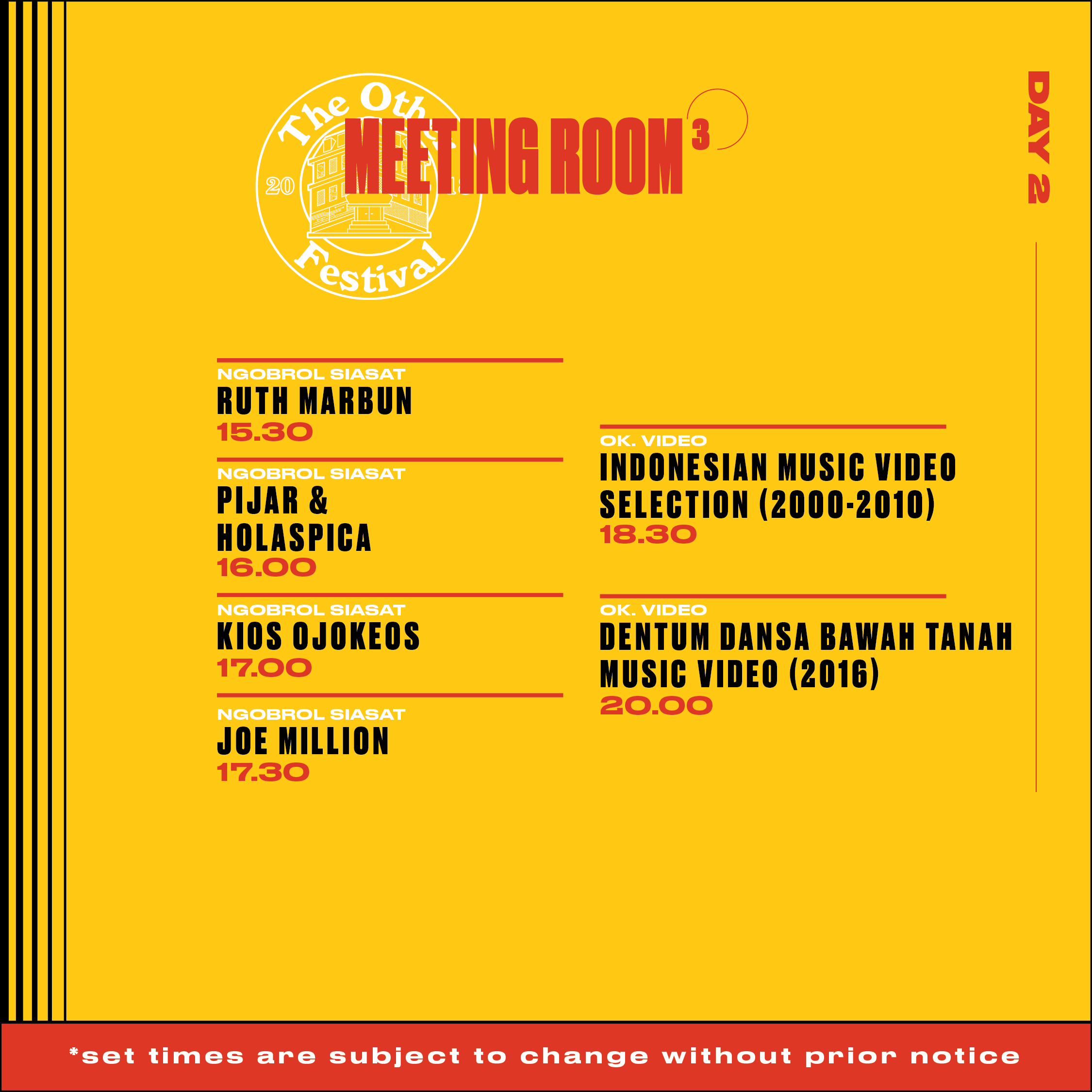 Lalu, akan ada sesi dengan Joe Million yang khusus datang dari Sukabumi untuk berbincang-bincang tentang militansinya main musik. Juga ada sesi dengan Holaspica dan Pijar, band perantauan asal Medan. Kami akan membahas bagaimana mereka melihat Jakarta dan apa kegunaan menembus pasar ini. Yang terakhir, saya mengundang Akbar dan Asra dari Kiosojokeos untuk membahas bagaimana ruang alternatif bisa diinisiasi oleh sebuah kolektif yang punya basis massa baik.